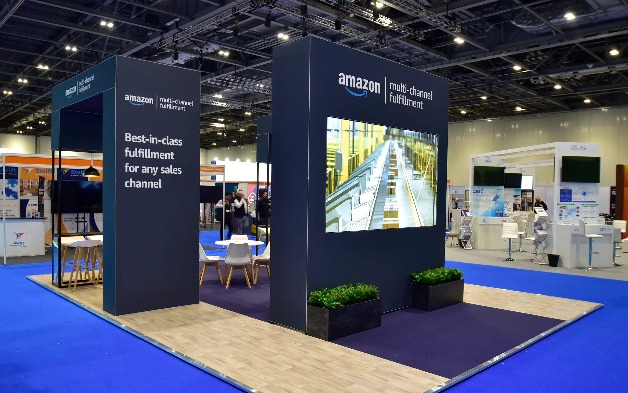 That first project was just the beginning. Since then, Amazon MCF has trusted Tecna for all their exhibitions, expanding their presence across multiple shows and venues. We’ve evolved their stand designs over time, adding video walls and striking architectural features to maximise visibility and impact.